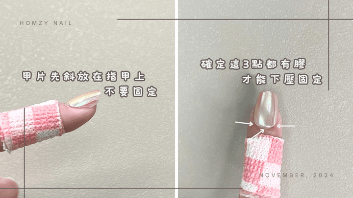 甲片先45度放置在膠上(靠指緣處),先不要下壓固定,