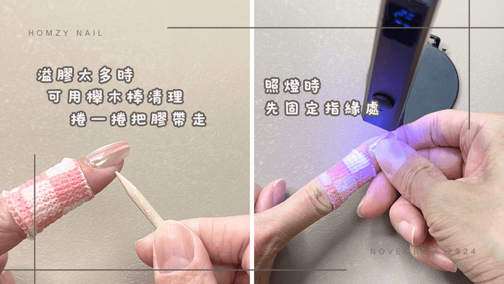 如果指甲甲床很長,果凍膠一張不夠,可以再補一張在沒貼到的甲面上,