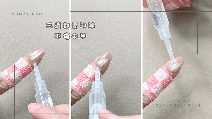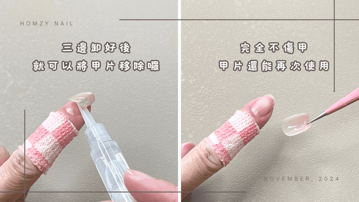 基本上,不要過度用力,卸甲動作要輕要慢,指甲都不會分層,