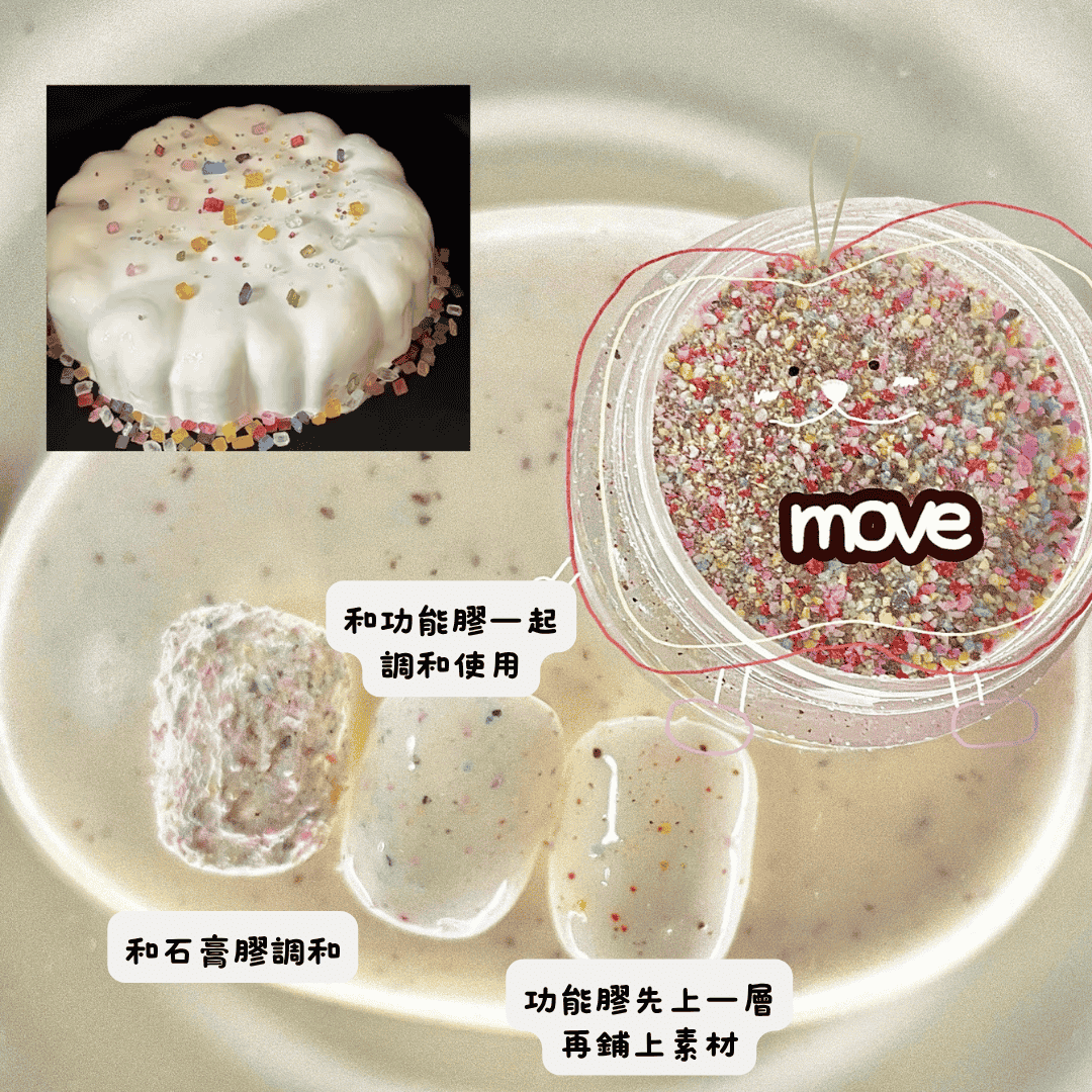 ・這款鑽石糖蛋糕粉可以少量平鋪當底部造型,也可以和軟糖膠一起做成飾品喔!