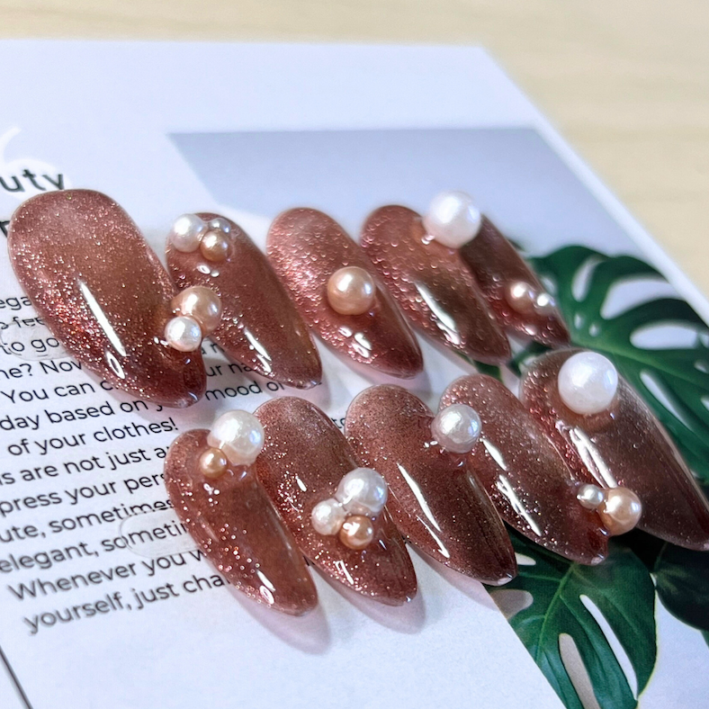 現貨S 美甲師手作穿戴甲 聖誕節那種貓眼 亮亮珠珠杏仁甲 除了紅貓眼之外還有咖啡色金色芋紫色