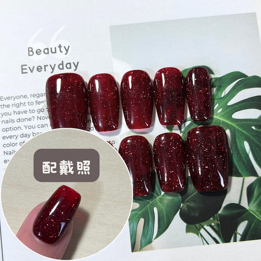 現貨M 美甲師手作穿戴甲 聖誕節到過年都可以用的深紅色 自帶閃耀粉 超人氣此度短梯甲❤️